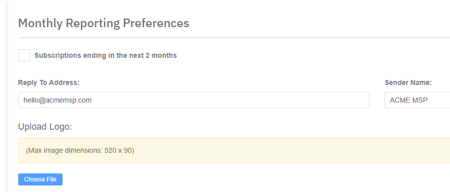 Here you can upload your logo to be used with reports and set a sender name for the emails that go out.