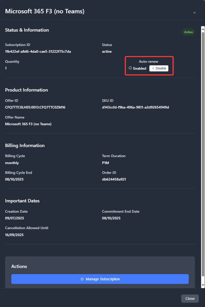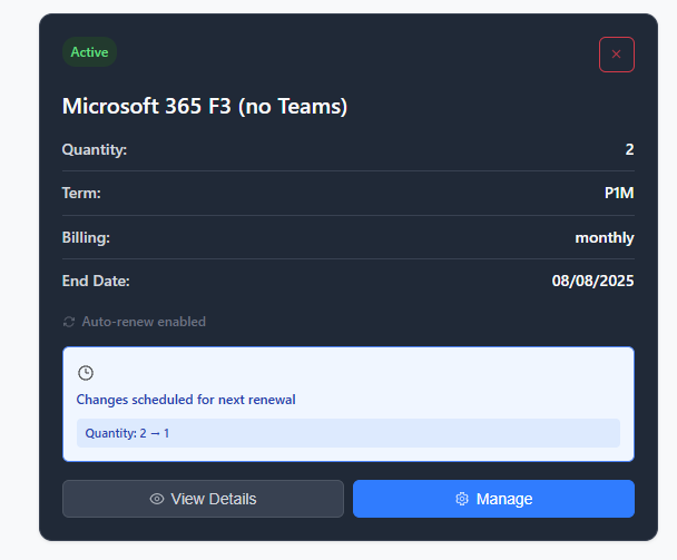 - Quantity can only be reduced during the subscription renewal period, if it is not currently in this period the portal will give you the option to schedule the change for the next period